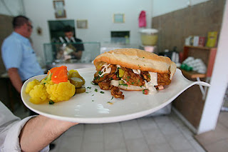 ישנם כמה מקומות בארץ שמתחרים על תואר הסביח הטוב ביותר (במיוחד זה שאין להזכיר את שמו מגבעתיים...) אבל כמו ההפתעה של המנה הזאת אין לאף אחד מהם. ההפתעה מתחילה כבר מאחורי הדלפק. הבחור שמרכיב את המנה עוטה כפפות לבנות צחורות בזמן שהוא יוצר את הקסם. גן עדן לאיסתניסטים וג'רמופובים. עוד לפני שהתחלתי לבקש משהו כבר קיבלתי סמבוסק חם עם מלית חומוס נפלאה. על חשבון הבית. בדיוק ככה עובדים סוחרי הסמים - "קח,תטעם, זה על חשבוני". והסוחר הזה יודע מה הוא עושה. הסמבוסק היה חם ופריך ומילוי החומוס היה מתובל בצורה נפלאה. הבעיה היחידה שאי אפשר להזמין עם פה מלא כי נופלים פרורים. אז הזמנתי עם הידיים, הצבעתי. מסביבי היו מצביעים נוספים. הרגשתי כמו בקלפי ביום הבחירות.